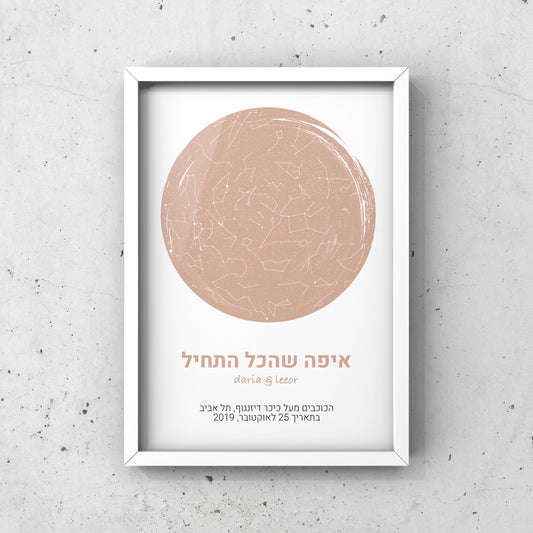 שלב 1. ⁠בחירת העיצוב: בוחרים בין מגוון הסגנונות של המפות כוכבים המופיעים אצלנו באתר. בוחרים צבע וגודל המסגרת, בוחרים כיתוב, ומוסיפים תאריך ומיקום של האירוע המיוחד שלכם. במידה ויש הערות נוספות, ניתן לרשום לנו בתיבה של "הערות נוספות"
